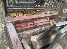 Устанавливаем новый гранитный цоколь. Гранит был выбран красного оттенка (лезниковский сорт гранита), так как хотелось, чтобы последние памятники, цоколь и новые памятники были в одном стиле.