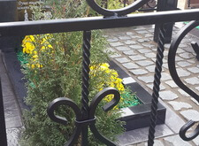 Покрасить ограду, так как чаще всего при установке ограды красят транспортировочной краской, которая приходит в негодность через год. Облицевать бетонный цоколь и бетон обрамляющий цветник. В данном случае для этого мы использовали керамогранит. Установили гранитные лавочку и столик. Посадили две туи и кустовые хризантемы в цветник. Заменили пластиковую вазу на гранитную. Уложили гранитную брусчатку на пол.
